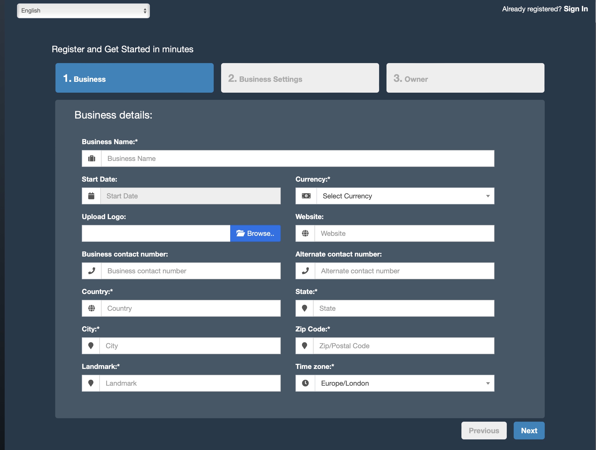 - Business Details: Fill out the relevant fields; select the appropriate currency & Time zone; click on Next. Time Zone & Currency can be different for different registered businesses.